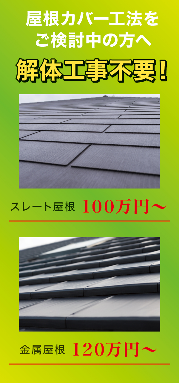 屋根の葺き替えをすべきか、カバー工法をすべきかの判断は素人には難しいため、屋根工事のプロフェッショナルである弊社が、無料で屋根の状態を点検して、ベストな方法をご提案させていただきます。